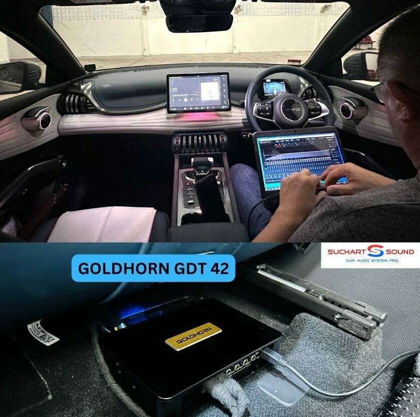 แอมป์+𝗗𝗦𝗣 𝗚𝗼𝗹𝗱𝗵𝗼𝗿𝗻 𝗚𝗗𝗧 𝟰𝟮 พร้อมปลั๊กตรงรุ่นรถ BYD ขนาดเล็กกะทัดรัด ติดตั้งใต้เบาะผู้โดยสารหน้า มาพร้อม Bluetooth 5.0 atpX สามารถสตรีมเพลงออนไลน์แบบไม่สูญเสียข้อมูลซึ่งดีกว่า Bluetooth OEM