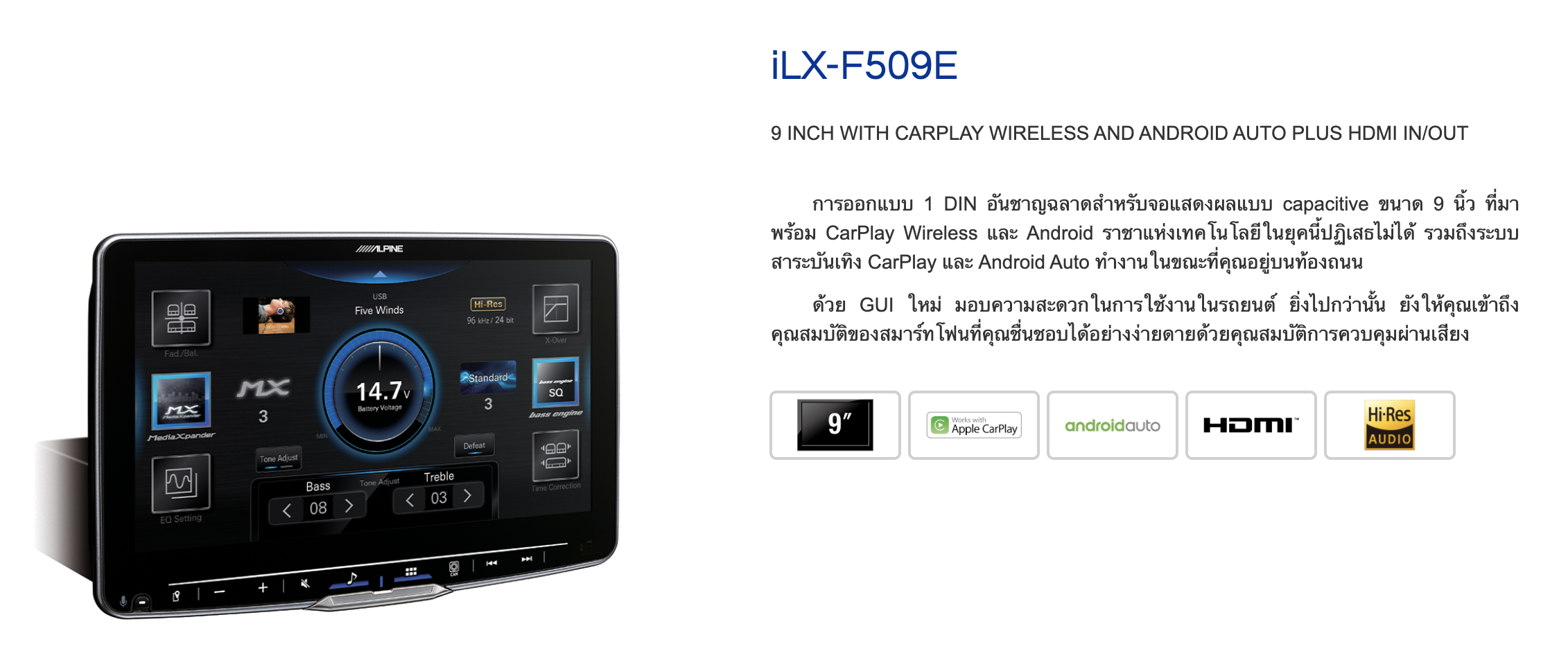 • 9 inch Capacitive touch screen (1280 x 720) • CarPlay (Wireless) • Android Auto (wire) • Bluetooth phone and music streaming ( LDAC ) • USB for music and VDO MP3/WMA/AAC/FLAC/WAV/MP4/MOV/FLV/MKV • HDMI IN/OUT