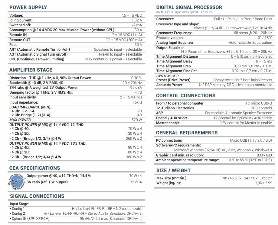DSP Amplifier | 520 W | 9 CH DSP + 4 x 130 W @ 2 ohm | D-class Fully Bridgeable