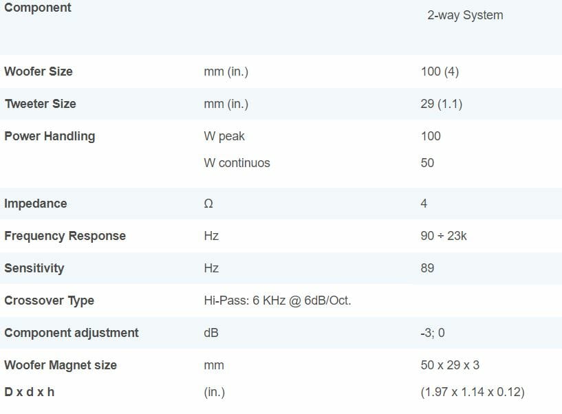 Audison has engineered this BMW upgrade component set with 100mm midranges, 29m Tetelon textile-dome tweeters, and matching crossover filters. The midrange and coaxials are available in both 3-post frame sizes used by BMW and MINI. Connection is plug-and-play. These speakers can be used as replacements with OEM amplification, but the best results are attained when used in a system upgrade that includes Audison Forza bit amplifiers and Prima BMW integration harnesses.
