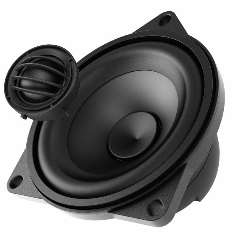 Midrange: This 100mm-class midrange uses a cast-aluminum frame, and is designed for BMW and MINI fitments. Connection is plug-and-play. The neodymium-alloy magnet provides more motor strength in a smaller package, permitting fitment into the shallowest BMW doors. The vented rear pole assists with cooling and improves power handling. For some models, an optional door mounting adapter is available.