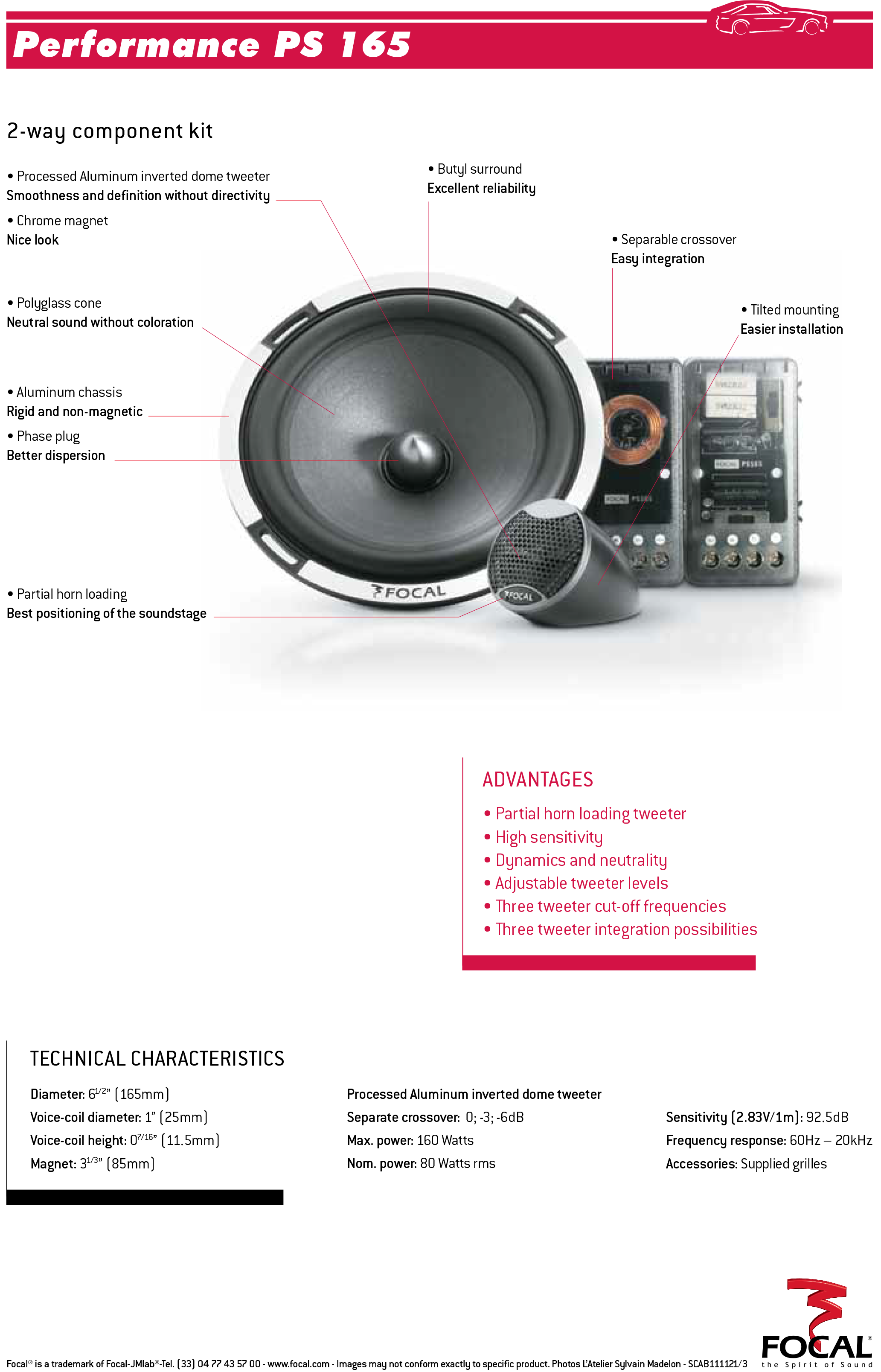 The PS 165 aluminum tweeter sports Focal’s inverted dome structure for wider dispersion and extended high-frequency response, giving you sparkling detail in the high notes. Three different mounting possibilities let you get creative with a custom installation and get hands-on with the stereo imaging in your car.