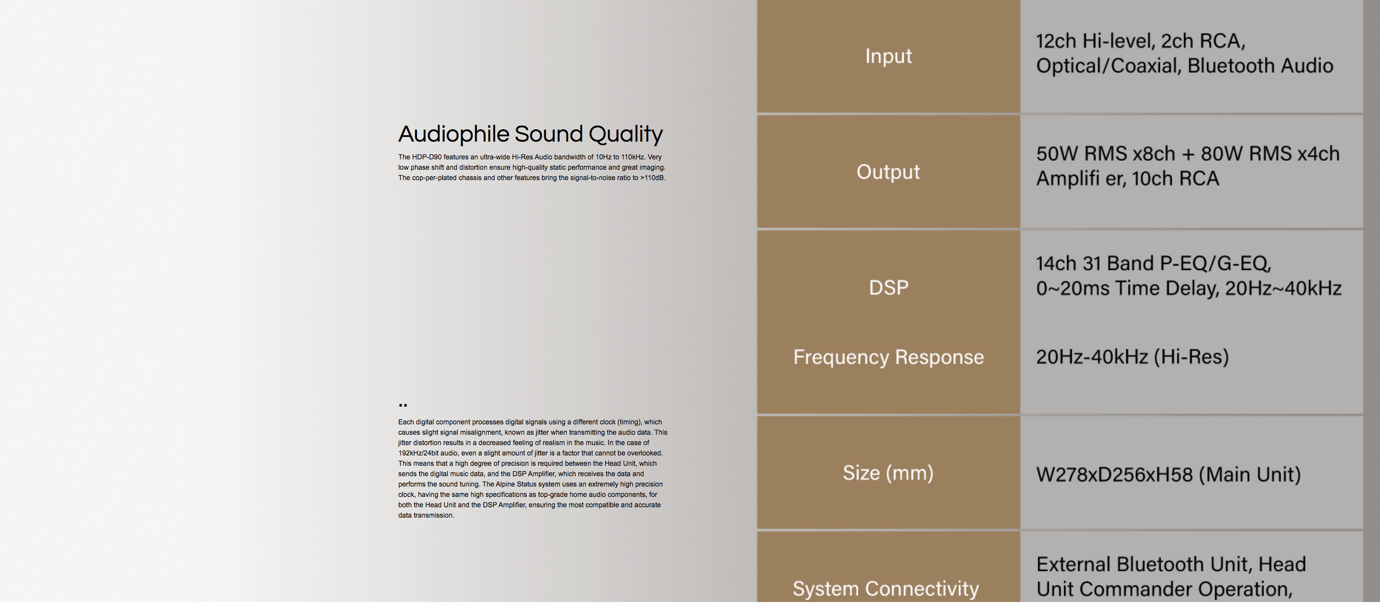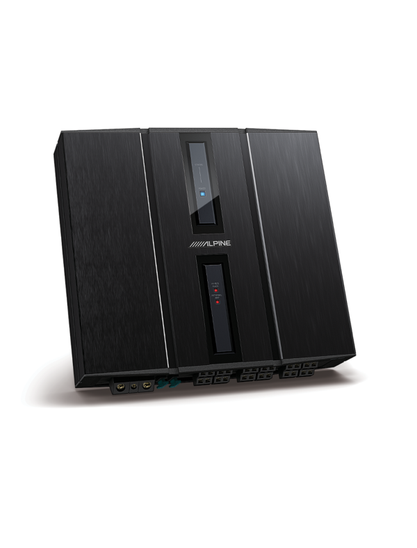 This DSP amplifier uses many components and technologies of the AlpineF#1Status processor for audiophile sound quality and is very flexible with tons of different input and output capabilities. It runs an internal sampling rate of 192kHz / 24bit and features a 14-Ch 31-band P-EQ, 3-Way X- Overs, and 12-Ch digital time correction with 7mm steps adjustment.